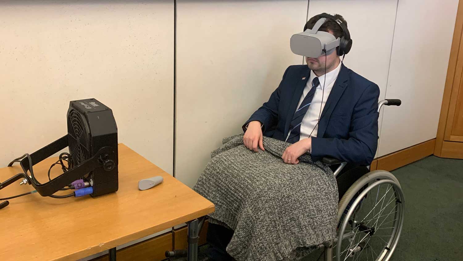 For the event at Portcullis House, we added a multi-sensory layer to the experience. Collaborating with technical designer Mike Ross, we introduced wheelchairs, lap rugs, DMX-controlled fans, and Subpacs that simulated sea wind and subtle vibrations. These tactile elements heightened the realism, allowing participants to feel wind on their faces and vibrations through their bodies, fully immersing them in Elizabeth’s story.